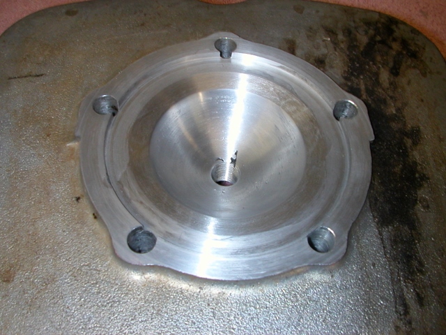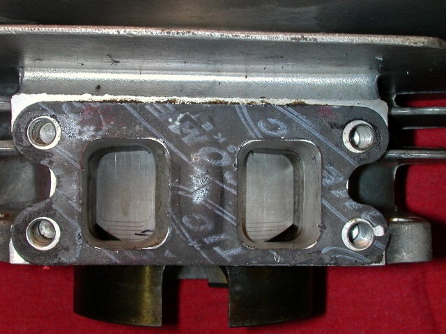 The stock CZ400 head offset dome The welded and recut "centralized" hemi dome. A view of the head from the outside shows the new centralized spark plug location. The old plug holes were welded up. Inlet Issues - All CZs of the 60s/70s came stock with a "piston-port" type inlet. In a piston-port inlet, the inlet port timing is controlled by the rear piston skirt exposing and blocking off the inlet port. Piston ports are the ultimate in simplicity, and a well configured piston port can be made to produce very respectable peak power, along with a wide powerband. It bears noting that production Honda CR250's were not fitted with reed valves until 1978, and Suzuki RM250s were not fitted with reed only inlets until 1981.