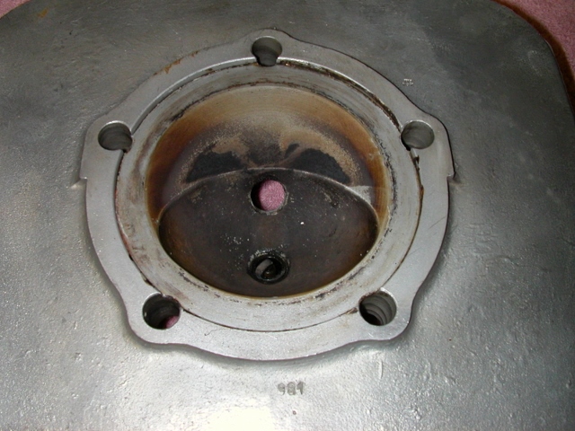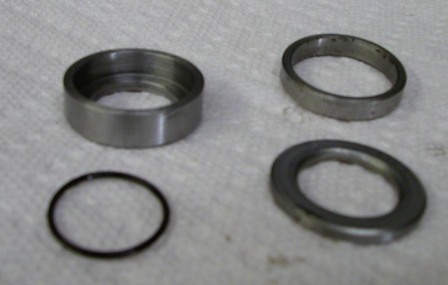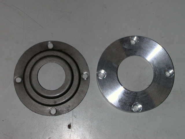 BELOW - We fabricated a 1-piece version of the two parts, and added an "O" ring to perfectly seal off the air leak. It is a close tolerance part ... but it was the only way to consistently seal the leak.ABOVE - After years of use, the stock "tin" right crank bearing retainer plate was bent .015" from the ID to the OD. The bending of this plate caused a major air leak, and allowed .015" of additional crankshaft side play.