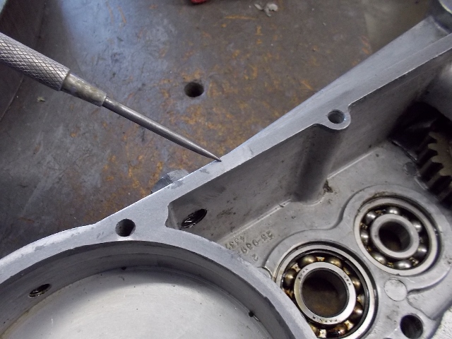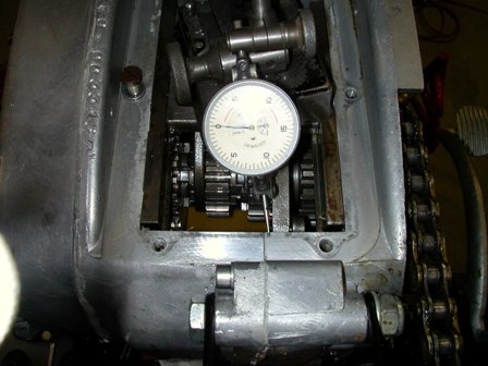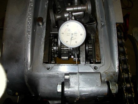 TOP LEFT - We used a dial indicator to show the mismatch of the two crankcase sealing surfaces. This photo shows the indicator at zero on the right case.
