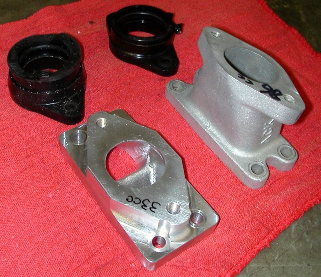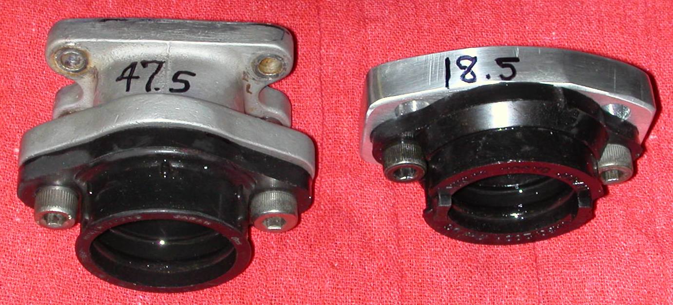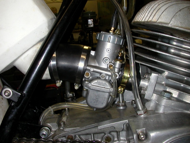 For our CZ400 package, we fabricated a short billet inlet manifold in an effort to get inlet passage volume to an absolute minimum. We fitted our billet manifold with a snow-mobile grade Mikuni rubber carb mount to avoid the rubber tearing failures so common to the less durable motorcycle versions. The end result was reducing total inlet manifold volume to 33cc from 86cc. The changed carb position did require a longer tube between the carb and airbox, but added length in that area has zero impact on inlet signal or performance. The end result of the modification was much easier starting, better low speed carburetion, and noticeably quicker throttle response. It bears noting that we also made a similar inlet manifold for the 1975 Rex Staten USGP bike, but Rex's dad wouldn't let us try it because the jetted bike was already faster than any open bike around .... I was only 20 years old, and Rex's dad was boss.