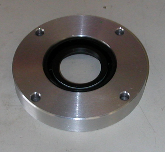 BELOW - The new billet seal holder was made to capture the crank seal.Airleak Apparatus - Likely one of the reasons that few CZ engines get pressure tested is because the tooling to properly seal off the exhaust port is not simple. We made a couple of versions before finding the setup that sealed consistently. The final version was an aluminum puck whose diameter fit very closely into the machined diameter on the cylinder. Even with the close fit, the plug was not airtight, so we fitted an "O" ring that finally made for a perfect seal. The plug was held in place by a simple steel strap. While the fabrication of the plug was a bit close tolerance, the compact design of the block-off allowed for easy sealing of the exhaust port with the engine still in the chassis.