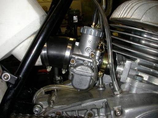 The photo on the left shows the carb mounted on the short billet manifold. The reduced inlet volume resulted in easier starting, quicker throttle response, and much better overall carburetion. A slightly longer air boot was needed to reach the airbox, but that length does not harm performance in any way. |